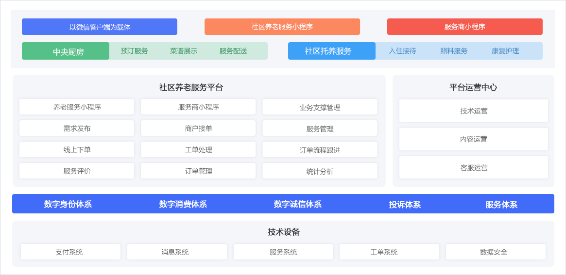創新“家社院互融”養老模式,基于“社區養老之家”提供“中央廚房、社區日托“等兜底服務,建設健康小屋新形態。同時吸納周邊服務商,依托養老機構護理能力,整合五大類智能終端,形成10大類300多項生活幫助、家庭床位、適老化改造、居家安防等專業、個性、便利的養老服務。輻射3公里范圍內居家老人,通過呼叫中心提供24小時守候式服務,為老人、子女、社區、政府提供支撐。