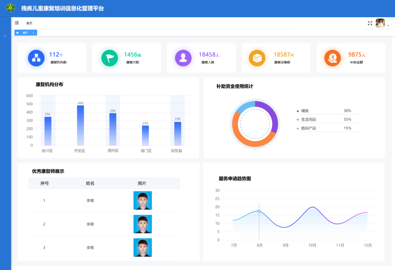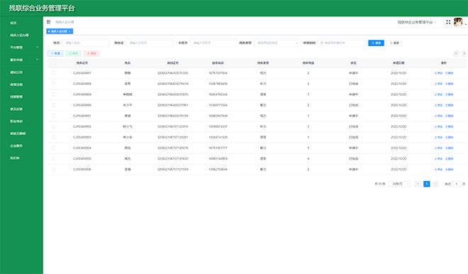 通過搭建“省-市-區(qū)(縣)-街道-社區(qū)”五級(jí)管理體系,建設(shè)殘疾人檔案、機(jī)構(gòu)、輔具、康復(fù)、就業(yè)、慈善、無障礙等方面的綜合業(yè)務(wù)管理平臺(tái),滿足主管部門的業(yè)務(wù)協(xié)同、數(shù)據(jù)交換、部門溝通等的扎口管理需求。借助“助殘服務(wù)直通車“,配套5大類助殘智能終端,提供輔具租賃、居家安防、居家探訪、兒童康復(fù)等助殘服務(wù),實(shí)現(xiàn)殘聯(lián)工作統(tǒng)籌整合、有序管理,提高基層人員工作效率,提升殘疾人幸福感。