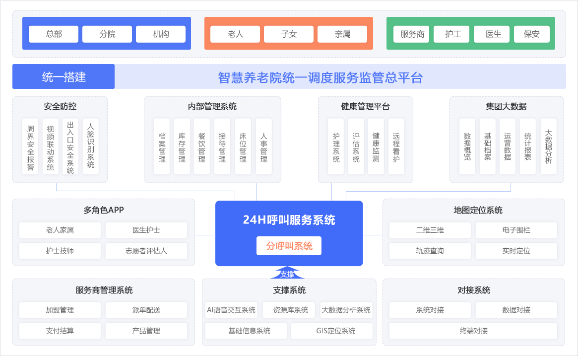以集團化管理作為頂層設計,為養老機構進行信息化、智能化建設,圍繞養老機構基礎信息、綜合業務、健康評估、餐飲管理、護理服務、健康監護、安全防護、大數據分析預警等搭建統一平臺,圍繞老人身體特征監護、安全定位、全院一卡通行、房間智能化、安全預警、出入口門禁等方面部署智能終端,輔以不同角色的APP、小程序,最終實現領導總覽全局、工作人員方便實用、老人簡單易懂,子女實時掌握的格局。